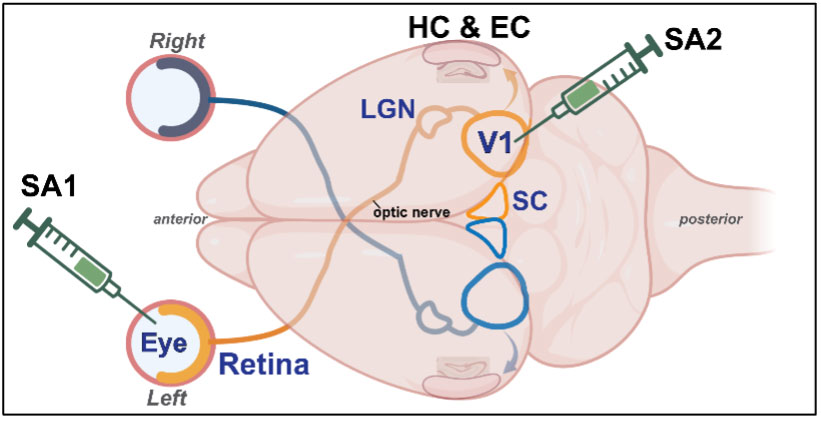 We are investigating how presence of pathological Aβ or tau proteins in the retina causes damaging changes along the primary retinal pathway to primary visual cortex (V1), and whether disease mechanisms can then spread via V1’s interconnections to brain regions affecting learning and memory. To study this, we are experimentally injecting Aβ or tau and proteins into either the eyes or V1 of healthy mice and measuring the effects of this manipulation on visual system circuitry using a combination of electrophysiological and immunohistochemical techniques.