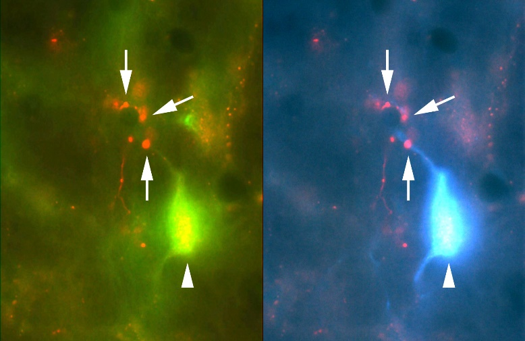 We discovered that auditory midbrain cells (arrows) heavily upregulate specific receptors (magenta) during middle-age and the subsequently downregulate the receptor during old age. The loss of these receptors in old age may underlie aspects of age-related hearing loss